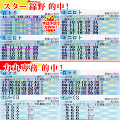 ![]() [誕生月を前に当せんモード突入!?] 2025年11月15日 ![]() 10日(月)、やりましたよー! 週明けロト6で4等ゲット‼ しかも本誌予想から‼ 「たくみ」錦野、やるときはやるんです! うれしーっ! 対する専務は5等2口をQPで軽やかにゲット‼ 続くナンバーズ3では、当せん数字「256」を「155」グランドスラムで狙ってた専務。風車盤百の位「1」の隣が「2」、一の位「5」の隣が「6」なんですよーっ! 思わず「何コレッ‼」と専務。 11日(火)は、ミニロトで僕が4等3口ゲット! やっぱりミニロトと相性がいいかも♪ ナンバーズ3では専務が当せん数字「758」を「857」グランドスラム狙いでボックス当せん! 調子上がってますねー! 続くナンバーズ4でも当せん数字「3403」を本誌予想「9088」が裏っ! なにかキテマスよー! 12日(水)は、またも専務! ナンバーズ3で当せん数字「663」を「366」グランドスラム狙いでボックス当せん! さらにナンバーズ4でも当せん数字「2123」を「2251」「2201」で狙っていた専務! 惜しいーっ‼ 13日(木)はまたも専務が魅せます! ナンバーズ3当せん数字「790」をなんと「791」グランドスラム狙い! 抽せんライブを見ていた専務、思わず叫びました‼ 続くナンバーズ4でも当せん数字「9991」のトリプルを「2292」「7797」とトリプルは読んでいた専務! これまたTHE匠全開です! 迎えた14日(金)は、ナンバーズ3当せん数字「706」を「967」グランドスラム狙いでひとつ違い! これまた惜しかったーっ‼ 今回はここまでで2人合わせて、783週連続当せん。オススメ数字は、やっぱり大谷翔平選手! 米大リーグのMVPに「3」年連続、「4」度目の受賞! もはや生ける伝説です! 超速ロト・ナンバーズTOPへ(C)イマジカインフォス