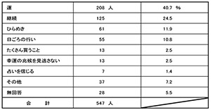 最も多かったのは、やはりこれ「運」!208人が回答し、実に41%という高さ。やはり、「運」は高額当せんに必要不可欠な要素なのだ。