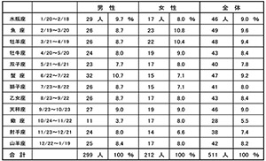 次点は、男性が「水瓶座」で29人(10%)。女性は「牡羊座」で22人(10%)。