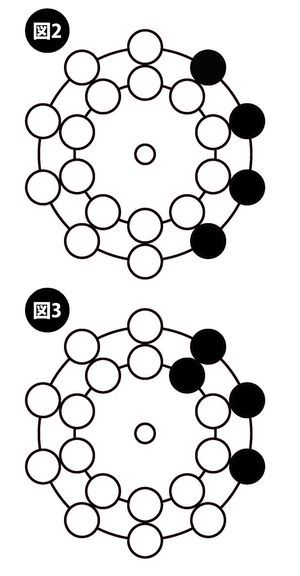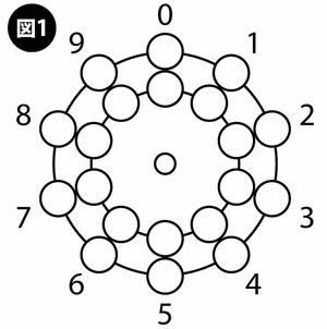 予想者・大石工房さんが考えた「回転盤」を使った予想方法。 図1に示したものが、大石工房さんの「回転盤」。風車盤からヒントを得ているため、形はそれによく似ています。便宜上、数字を「0」から時計回りに「9」までの10個書いてあります。これに実際に出た当せん数字を当てはめて、どのようなパターン(配置)になるかを分析していく方法が、この攻略法の真骨頂です。 ![]() 大きな円の外側に「0」から「9」の数字を時計回りに書き、円周上に10個の(○)を配置します。さらにその内側にも同じように10個の(○)を配置。出た数字の(○)を(●)にしていきます。そのパターンを数字にかかわらず集計して予想に生かしていくのが、この「回転盤攻略法」です。