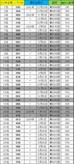 ![]() [「かくれんボックスシングル、#16」] 2025年5月28日 ![]() 〜〜〜〜〜〜〜〜〜〜〜〜〜〜〜〜〜〜〜〜〜〜〜〜〜 「かくれんボックス」とは、読んで字のごとく「かくれて見つからないボックス数字」のことだ。 上記の表は、5月23日(金)第6732回終了現在の長期未出現ナンバーズ3シングルボックス数字。 コラムバックナンバー「かくれんボックスシングル#15」2月7日第6657回時点の表から出現した数字をグレーで網かけして、新たにボックス数字を追加して更新しました。 ※超速サイトコラムでは、表が見にくいと思いますので、超的中法WEBサイトのわたしのコラムで見てくださいね。 バックナンバーを確認していただければわかると思いますが、3ヵ月半更新しないあいだに、たくさん見つかりました。 8位「689」9位「123」11位「467」12位「037」15位「234」17位「146」22位「048」25位「235」27位「249」28位「078」29位「679」と11個出現。 現在のワースト1位は「245」で2021年12月20日より3年5ヵ月出現していません。 回号では第6732回終了現在、第5849回「245」より883回出現なし。 2位「356」は、2021年12月22日より出現なしで、回号では第5851回「365」より881回出現なし。 3位「056」4位「568」5位「136」6位「167」7位「039」8位「567」も2年以上出現なし。 第6732回終了現在、一の位「4」が、第6704回より28回出ていないので、表から「4」を探し一の位にあてはめ「254」「794」「074」「024」「584」「154」「384」「054」「374」が期待大。 シングルボックスペア数字ワースト1位「58」は、第6669回より63回出ていないので、「568」「589」「458」「578」が期待大。 2位「39」は、第6672回より60回出ていないので、「039」「369」が期待大。 3位「38」は、第6674回より58回出ていないので、「348」が期待大。 ストレートペア数字ワースト1位は、第6232回より500回出現なしの「8※9」なので、「829」「859」「819」が期待大。 2位は、第6277回より455回出現なしの「74※」なので、「749」「740」「743」が期待大。 3位は、第6285回より447回出現なしの「07※」なので、「075」「074」が期待大。 大穴数字が好きな人は、狙ってみてはいかがでしょうか?また、軸にしたい数字や出そうかなと思う数字があれば、かくれんボックス数字から選んでみてはいかが? ♪かくれんぼなんかしてないでもう出てあげるって 早く言ってもう当てたい その言葉が宙に舞う〜♪ 〜〜〜〜〜〜〜〜〜〜〜〜〜〜〜〜〜〜〜〜〜〜〜〜 今回のおすすめN3は、第6732回終了現在、第6669回より63回出現なしのボックスペア未出現 [58]狙いで 5点。 [258] [658] [758] [845] [859] 超速ロト・ナンバーズTOPへ(C)イマジカインフォス