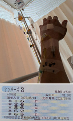 ![]() [「闘尿日記H」] 2025年8月13日 ![]() ご無沙汰ミニボックス未出現狙いでした。 〜〜〜〜〜〜〜〜〜〜〜〜〜〜〜〜〜〜〜〜〜〜〜〜〜 4月29日(火)退院して8日目、手術をしてから14日になるのに、いまだ血尿と出血が続き……、回復どころか日に日に出血量も増え、おしっこの色も真っ赤で、まるで血液を出してるようだ。それにドロッとした血のかたまりも出て、つまっておしっこが止まったかと思えば、ワインのコルク栓が抜けたみたいに、ビュッ!と勢いよく出たりする。なんだかパンツが湿ったみたいで、覗いてみると敷いていたトイレットペーパーがレバー状の大きな血のかたまりとともに真っ赤に染まり、パンツを通り越してズボンまで血がしみていた。なかなか血が止まらず、トイレットペーパーを敷くくらいじゃ間に合わなくなり、娘からもらった生理用ナプキンをつけている。病院の外来予約日は5月12日だったが、痛みもあるし、貧血?気味でフラフラしてめまいもするので、病院に電話をしてみた。祭日で先生がいないので、「明日の朝8時半にまた電話して下さい」と言われた。 4月30日(水)朝8時半に○○病院へ電話すると、今からでも来ていいと言われたので、さっそく車で向かった。受付をすませ、40分くらい待たされ、採血と尿を採ったが、真っ赤な血ばかりで10mlくらいしか検尿カップに出なかった。また1時間近く待たされ、名前を呼ばれると診察室ではなく、処置室に案内されてズボンとパンツを脱ぎ、ベッドに仰向けになった。主治医が来てエコーを撮り「これからぼうこうや前立腺や尿道にたまった血のかたまりをとるため、管を入れて洗浄しますね」と言われた。看護師に動かないように足を押さえつけられ、管を入れるとき、悲鳴があがるくらいめっちゃ痛く、麻酔無しで傷口を何度も何度もこれでもかとかき回され、韓国ドラマの時代劇さながら「さぁ白状しろ!」とまるで拷問を受けてるみたいだった。終わるとカテーテルがついており、貧血の数値も低いみたいで、このまま家に帰ることなく再入院となった。フラフラするので車椅子に乗って病棟に向かった。また前回と同じ東病棟515号室の4人部屋に入った。前回は窓際の奥だったが、すでに3人入っており、今回は入り口のトイレの前だ。窓際がよかったなぁ。妻がお店を早く締め、入院の用意をして4時頃来てくれた。病院の帰りにナンバーズを買う予定だったが、買いに行けないので車に入れていた申し込みカードで妻に買ってもらった。抽せんライブを見る。ああ〜ハズレだ。買ってもらわんほうがよかったな!でも3回継続で買っているので、あと2回で元以上が取れればいいか! 5月1日(木)昨日から点滴4本とカテーテルに繋がれ身動きが取れない。カテーテルから出る尿は赤く、止血剤や抗生物質の点滴を入れてるが、早く点滴が外れ、身動きが取れるようになると楽だけどな〜。痛みがあり座薬の痛み止めを今朝も入れてもらった。 病室には、あの「愛してる」おじさんが正面に、帯状疱疹の強面の人が左前方にいた。そして、前回自分がいた左隣のベッドには糖尿病?で80代のちょっと認知症?がはいった初顔の白髪のおじいちゃんがいて、何度も同じことを前の帯状疱疹さんに話しかけたり、散歩すると言って病室を出て徘徊し、自分の部屋がわからなくなったみたいで看護師に連れ戻されていた。 ――つづく。 〜〜〜〜〜〜〜〜〜〜〜〜〜〜〜〜〜〜〜〜〜〜〜〜〜 今回のおすすめN3は、第6787回終了現在、第6277回より 510回出現なしの [74※]狙いで 10点継続。 [741] [744] [745] [747] [749] [740] [742] [743] [746] [748] 超速ロト・ナンバーズTOPへ(C)イマジカインフォス