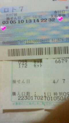 ◆ありがとう(*^_^*)ロト7 すまりん (20201134)/高知県/58歳/女性![]() ![]() 今日はN3、N4がストニア、ニアピンでしたが ロト7で5等当たることができました 嬉しいです(^O^) ありがとうございます ![]() ![]() ![]() 2017-04-07 20:17:05