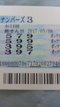 ◆ボックス当たりました ![]() なお(20189771)/大阪府/62歳/女性 ![]() 見たら 昨日買ってた 599がボックスで当たっていました ![]() 昨日は 全部奇数のダフルと予想しました。 予想が当たり嬉しいです(^O^) 2017-03-09 06:14:47