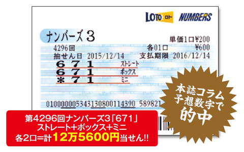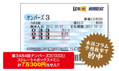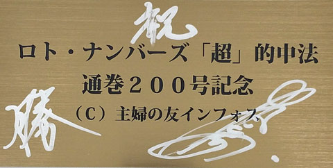 月刊誌『ロト・ナンバーズ「超」的中法』は2016年12月号で通巻200号を迎えました。その記念すべき200号表紙を飾るのは、な、な、なんとTHE・匠こと力丸仙務 ![]() (※あまりの専務の当せんの多さに、今年9月から専務の「専」を仙人の「仙」へ。また一歩名誉ある呼び名に。) 当サイトでも、大人気の連載コラム達人・スター錦野旦の『この世に数字がある限り!』でお馴染みの力丸仙務。錦野旦さんの奥様であり、事務所の専務、しかしてその正体は、ロト・ナン界の当せん女王 ![]() 今回は本誌通巻200号を記念して、力丸仙務の華麗なる“グランドスラム”の歴史を当サイトでも大紹介!さらにユーザーの皆さまの質問にも、答えていただきました! なお、絶賛発売中の『ロト・ナンバーズ「超」的中法12月号』では、力丸仙務のインタビュー記事を掲載。仙務の当て方、予想法などを「心・技・待」の3つのカテゴリーで紹介してます。「心」では、ロト・ナンに向かう姿勢や当たりをどう引いてくるか、という精神的な話を。「技」では、仙務が実践している予想数字の出し方、当せん数字の見方を紹介。さらに「体」ではなく「待」では、抽せんで数字が決まるまでの仙務のロト・ナンの楽しみ方を紹介しています! 『ロト・ナンバーズ「超」的中法12月号』もチェックしてみてください♪ ◆グランドスラム通算18回達成! すごすぎる仙務のグランドスラムの歴史 当サイトではお馴染みかもしれませんが、グランドスラムを知らないユーザーのために、グランドスラムとは何か説明いたしましょう。 グランドスラムとは、ナンバーズ3における、「ストレート」「ボックス」「ミニ」すべてが的中している券のことです。力丸仙務はこのグランドスラムを通算18回達成しており、そのうち2回は本誌予想からの的中だから驚き 獲得金額は総額557万3800円![]() 仙務のグランドスラム当せん実績は、別ページですべて掲載してます♪ ![]() ![]() これが力丸仙務のグランドスラム当せん券! ちなみに 2枚とも本誌予想からの的中! ◆教えて力丸仙務! 数々の当たりをゲットしてきた力丸仙務。もちろん、力丸仙務には、当サイトユーザーからたくさんの質問が寄せられてます!今回、その中から、いくつか答えていただきました♪ Q1)力丸専務は数多くの当たりを出していますが、どうしてそんなに当たるんですか? Q2)錦野旦さんの『この世に数字がある限り!』を読んでいると、力丸専務は特別な日(誕生日や記念日、TV出演のときなど)に強いイメージがあります。何か特別なことを行ったりしているんでしょうか? Q3)当たりから遠ざかると、落ち込んでしまいます。何かアドバイスをください。 Q4)専務の数字選びのコツを教えてください! ◆通巻200号記念! 力丸仙務のサイン入りプレートをプレゼント 通巻200号を記念して、スペシャルプレゼントをご用意しました! なんと力丸仙務の直筆サイン入り『通巻200号記念オリジナルプレート』を、抽せんで1名様へプレゼント! 200号記念用に、特別に制作した一点ものに加え、ロト・ナン女王のサイン入り! 運気が上がりそうです。皆さまからのご応募お待ちしてます! ![]() (文/編集部員T)